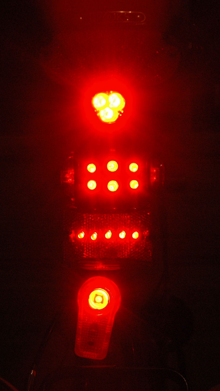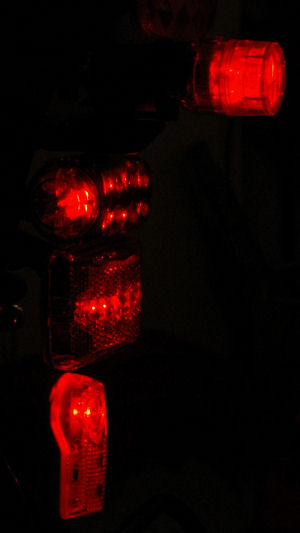 On each photo, we see from top to bottom: the BLT Rear Super Doppler, the Cateye TD-LD1000, the Vistalite Super Nebula and the Planet Bike Superflash.